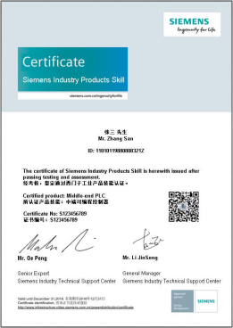权威—— 西门子工业产品技能认证证书由西门子工业支持中心官方认证,并由西门子全球高级核心专家签署颁发。